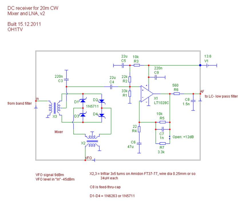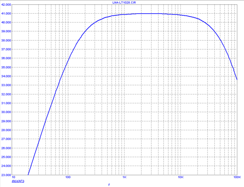 Frequency response of the amplifier (without the mixer), voltage gain in dB